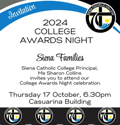 Our College Awards Night is an event celebrating the gifts and talents of our students. Eligible students from all year levels will be presented with Academic, Co-curricular Academic, Cultural, Service and/or Sporting Awards based on their achievement and commitment to the College throughout the year.  We also present some highly regarded Special Awards to students who excel in exemplifying the Siena spirit and make a positive contribution to the school and wider community.